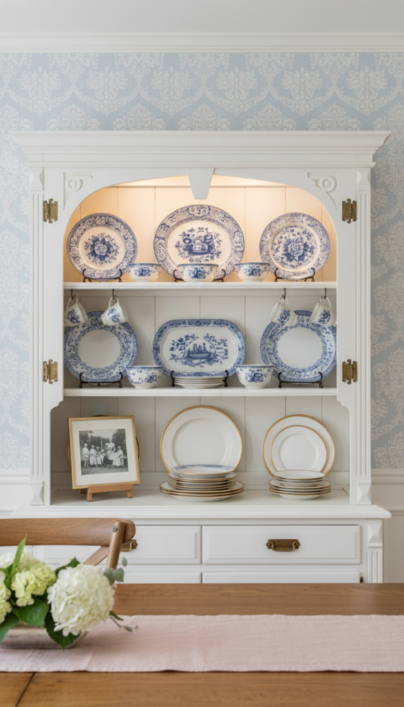 A hutch styled specifically to display heirloom or antique china is one of the most personal and emotionally resonant ways to decorate a dining room. These pieces — often blue and white transferware, delicate floral porcelain, or elegant gold-rimmed bone china — deserve to be displayed rather than boxed away, and a beautiful hutch is the perfect stage for them.