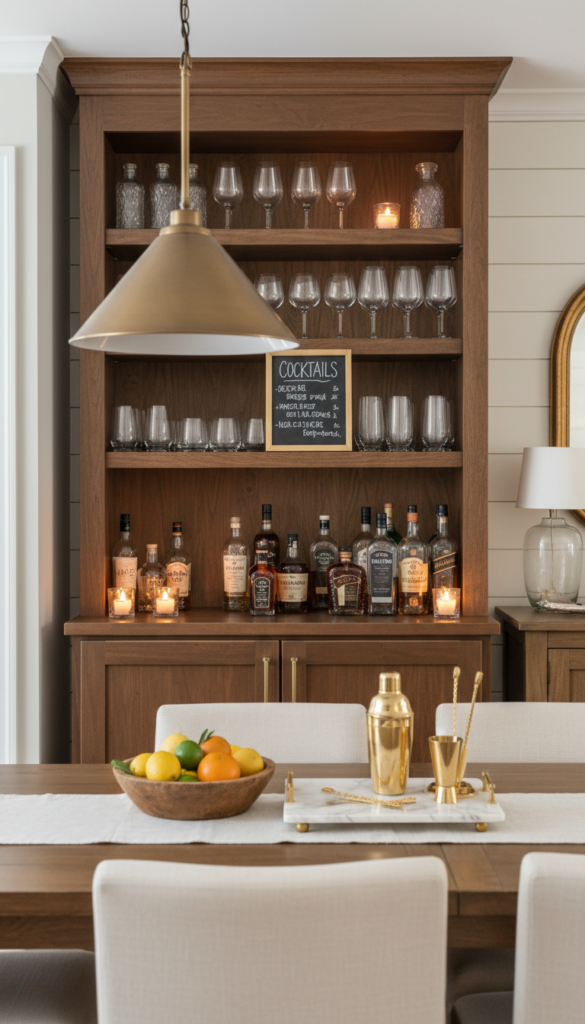 Styling Tips: Add a small round tray on one of the shelves to corral your most-used bar tools and give the display a sense of containment. A framed chalkboard cocktail menu leans beautifully against the back panel, and a small cluster of fresh citrus in a wooden bowl adds color and life.