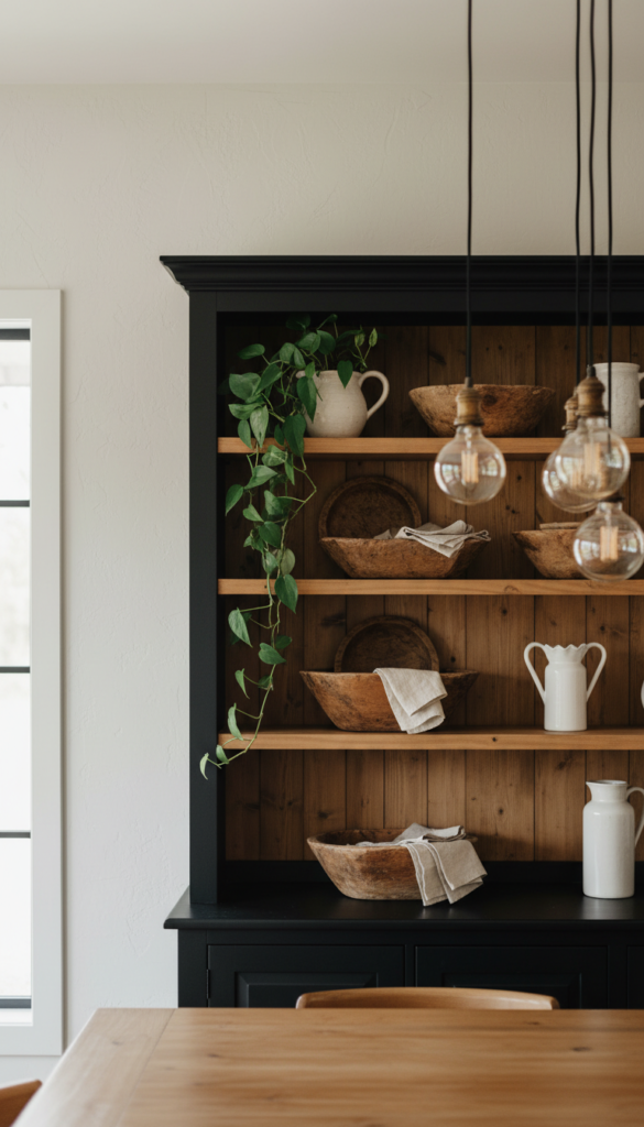 Styling Tips: Balance the darkness of the hutch with lots of natural elements. A trailing philodendron spilling over one shelf, wooden bowls, linen napkins in a warm neutral — these all soften the graphic quality of the black. Use warm Edison bulb lighting nearby to prevent the piece from feeling cold.