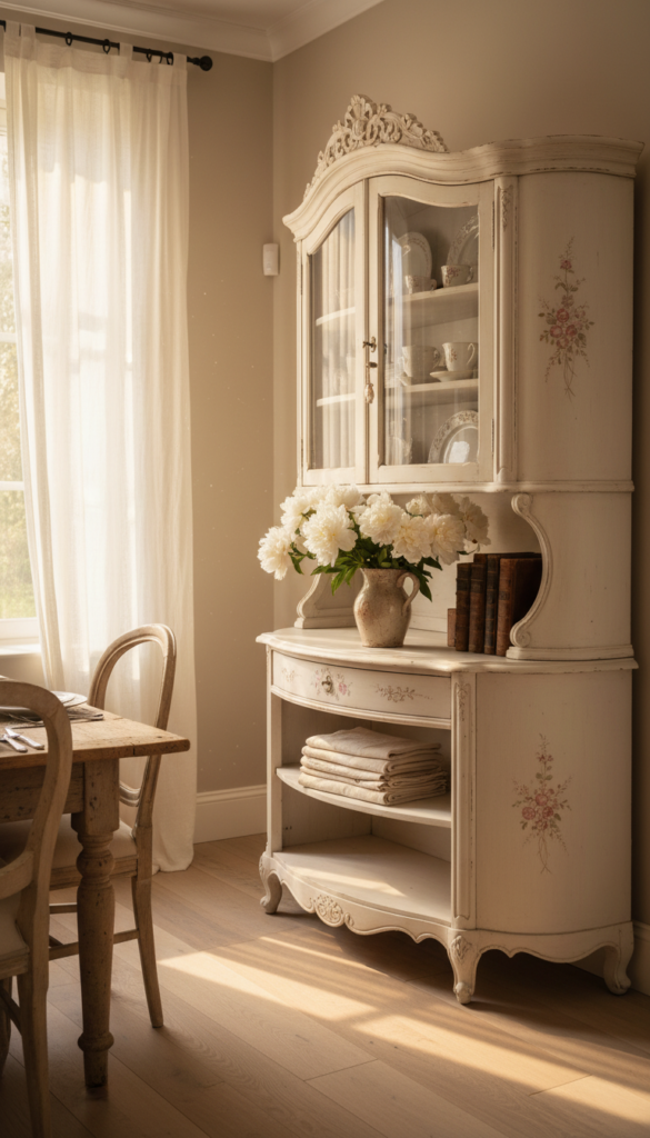 French country style and farmhouse aesthetics share a beautiful overlap, and nowhere does that show more clearly than in a vintage French country hutch. Look for pieces with carved crown molding, curved glass inserts, and cabriole legs. The slightly ornate details feel refined without being stuffy, especially when styled with relaxed, casual pieces like market-gathered wildflowers and rough linen.