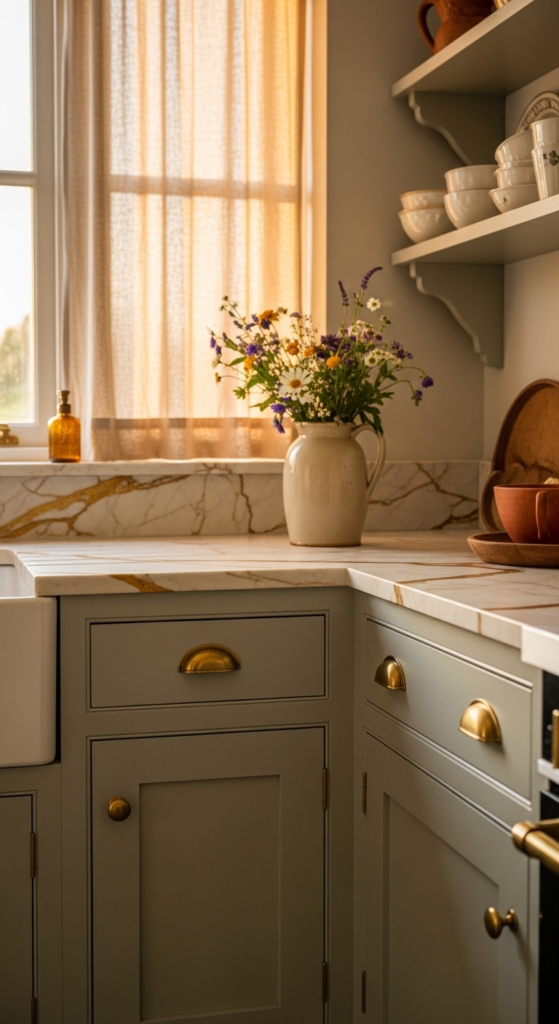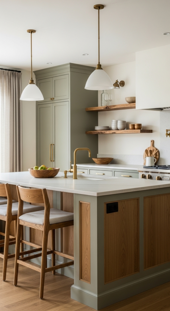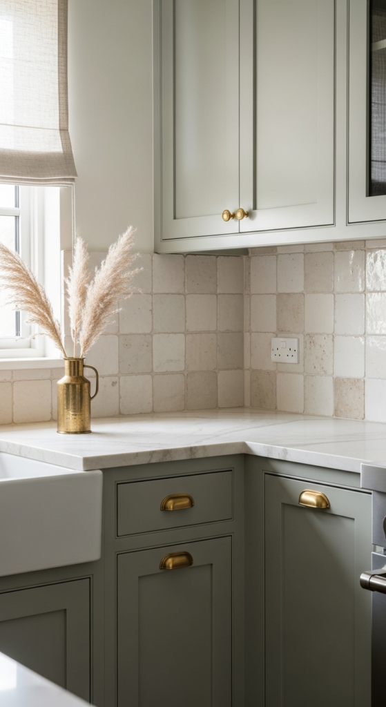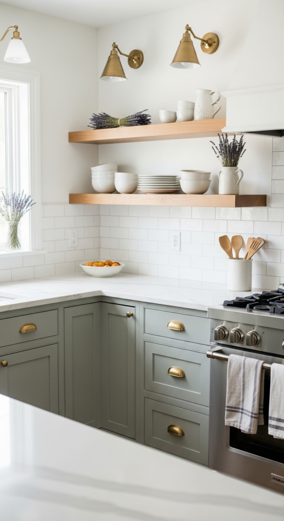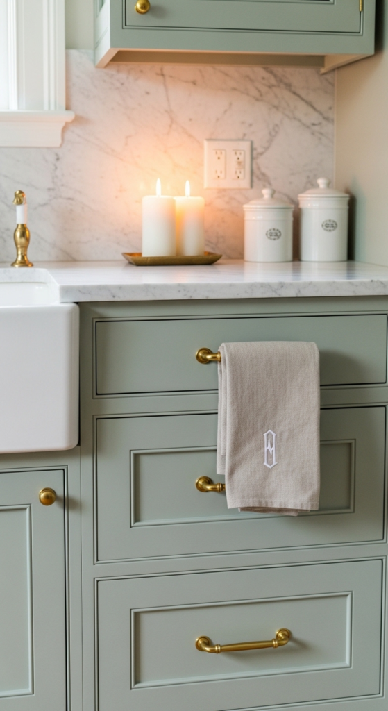 1. Shaker Cabinets in Muted Sage with Brass Pulls