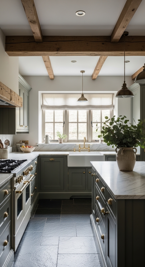 3. Full Sage Kitchen with Exposed Wood Ceiling Beams