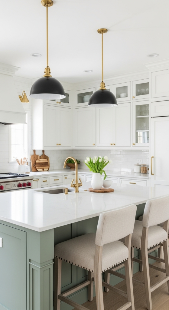 4. Sage Green Island with White Perimeter Cabinets