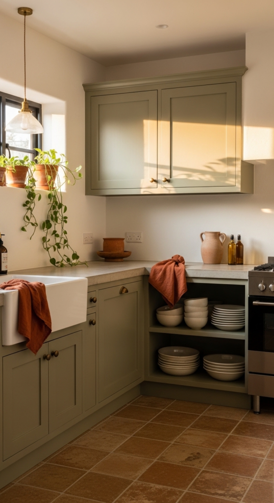 8. Sage Green Cabinets with Warm Terracotta Accents