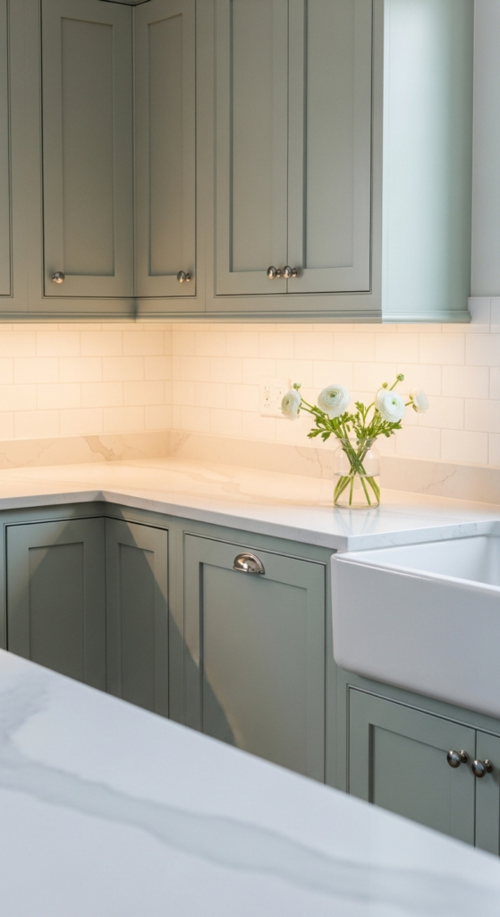 11. Sage Cabinets with Warm White Quartz Countertops