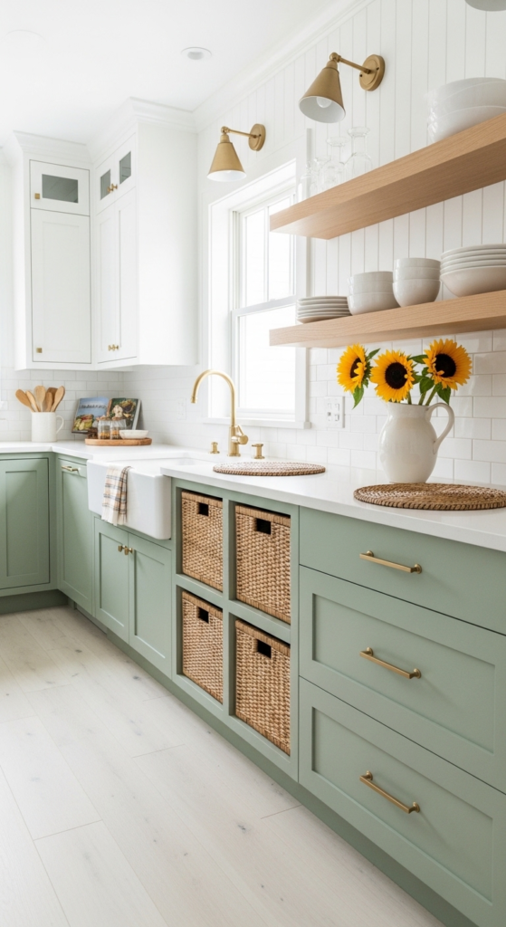 2. Two-Tone Sage Lowers with White Upper Cabinets
