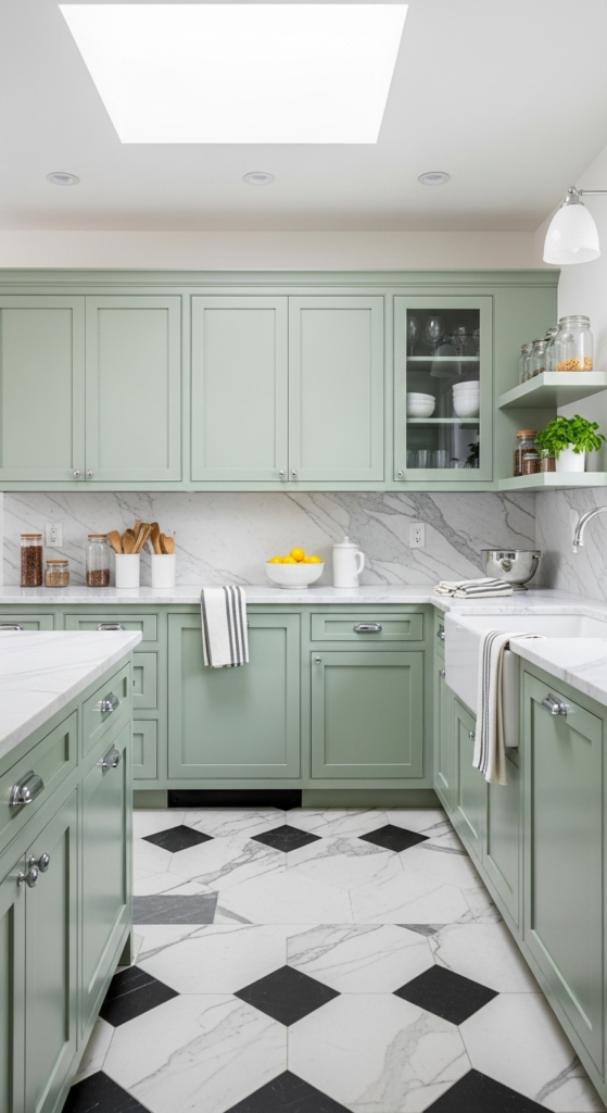 14. Sage Green Cabinets with Checkered Tile Flooring