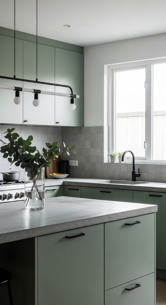 16. Sage Green Cabinets with Concrete Countertops