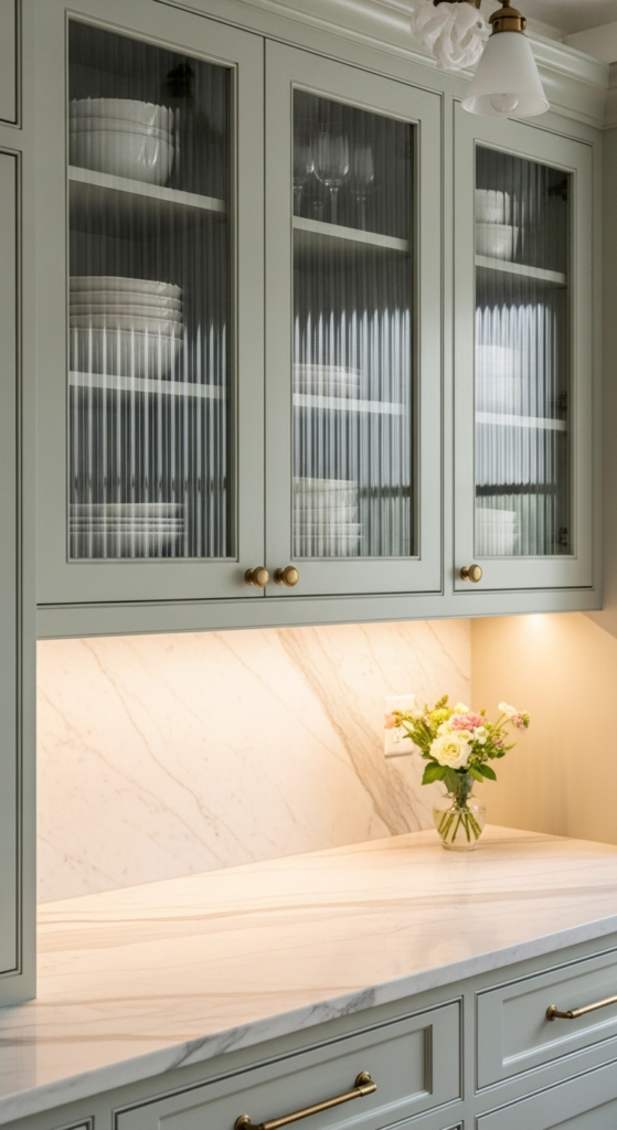Fluted glass inserts add quiet elegance and a soft vintage charm to sage cabinetry.