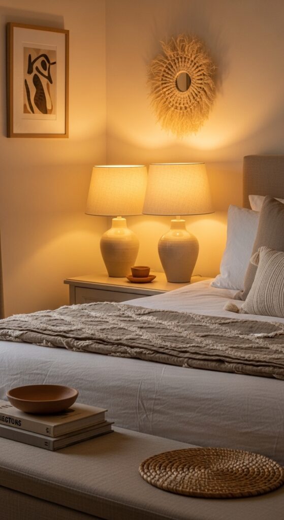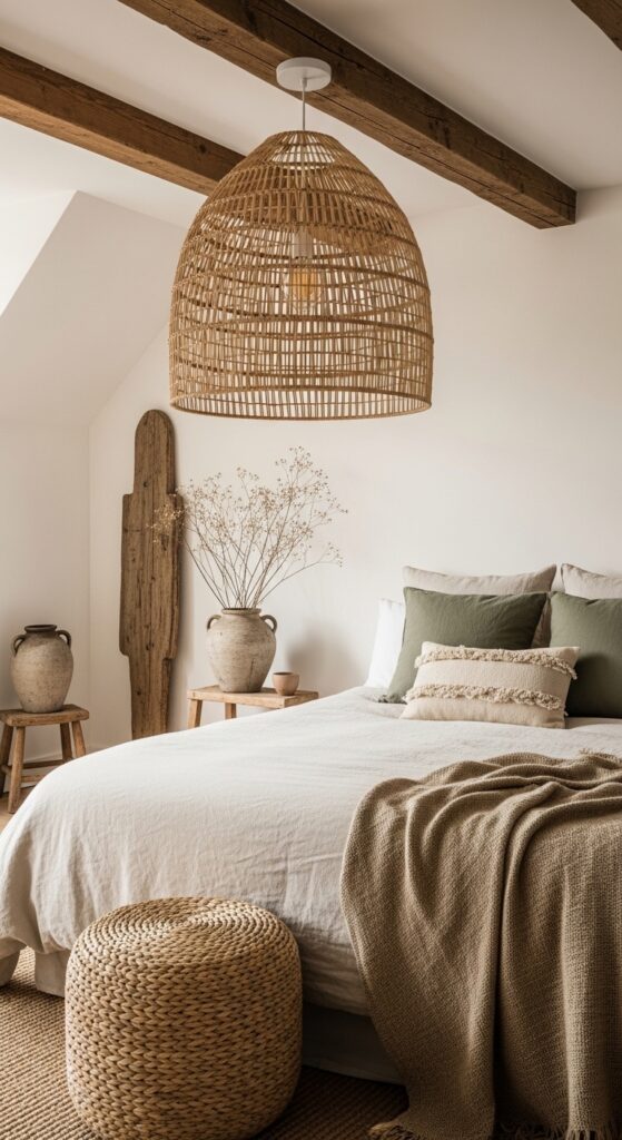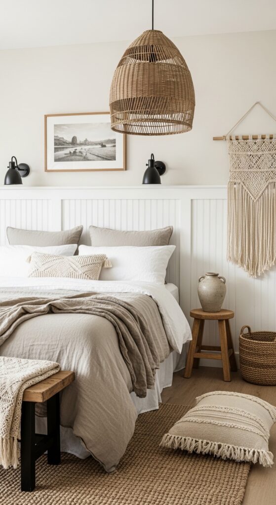 The best lighting mix includes one woven overhead fixture, one pair of bedside lights, and one softer accent source such as a floor lamp or wall sconce. Linen shades, aged brass finishes, ceramic lamp bases, and warm 2700K bulbs all support the style. Avoid exposed cool-white bulbs, which make natural textures look flatter and much less inviting.