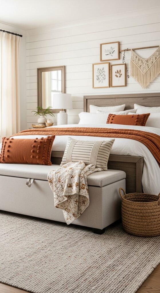 Why it works: A bench adds horizontal balance at the foot of the bed, which helps visually anchor taller headboards or layered wall art. In boho farmhouse rooms, hidden storage is especially useful because it lets the textures stay relaxed without letting clutter do the talking.
