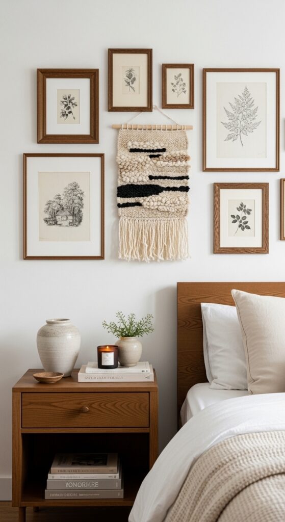 How to get it: Collect vintage frames in wood or antique brass finishes and keep the art palette quiet—charcoal sketches, botanicals, or sepia landscapes work well. Add one neutral textile piece, like a small wall weaving, rather than turning the whole wall into fiber art.
