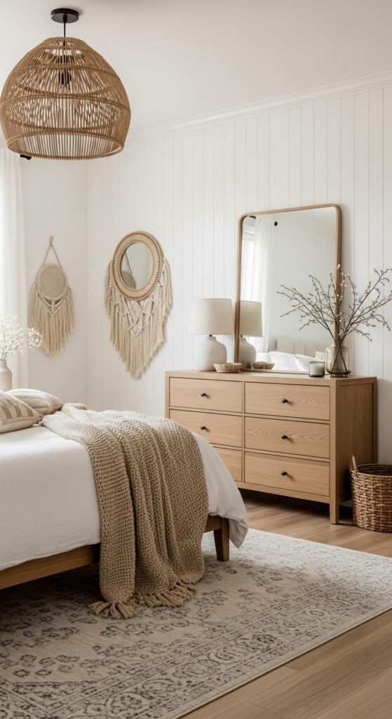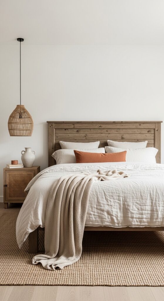 Yes, small bedrooms can absolutely pull it off. The key is restraint: prioritize one warm wall color, one natural wood tone, one woven light fixture, and soft textiles. Too many patterns or too many wood species will make a tight room feel crowded fast.