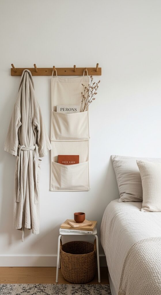 Why it works: Small spaces need vertical utility more than extra furniture. A peg rail or canvas wall pocket adds function without the visual block of another cabinet, and that keeps the room feeling lighter around the bed.