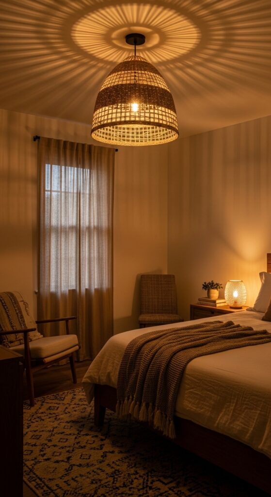 Why it works: An oversized pendant adds vertical presence without the visual heaviness of a solid chandelier. The woven shade filters light softly, which matters in bedrooms where direct glare can flatten every other material in the room.