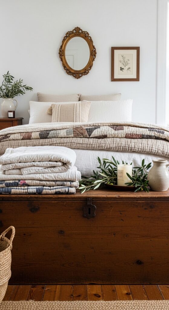 Why it works: A trunk adds patina and utility in one move. Its solid shape grounds the softer bed layers, and the old hardware introduces just enough contrast against linen, cotton, and jute.