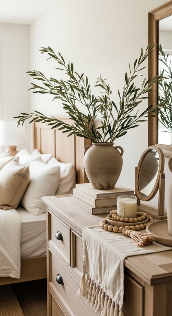 💡 Quick Win: One thrifted pottery jug plus faux olive stems can transform a dresser top for less than the cost of a new lamp.