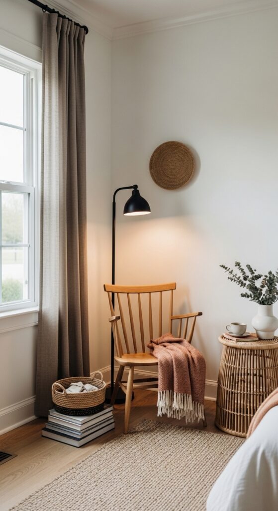 How to get it: Use one spindle or woven chair, one small floor lamp, and one surface for tea or books. Keep the rug compact so the zone is defined without slicing the room into too many visual pieces.