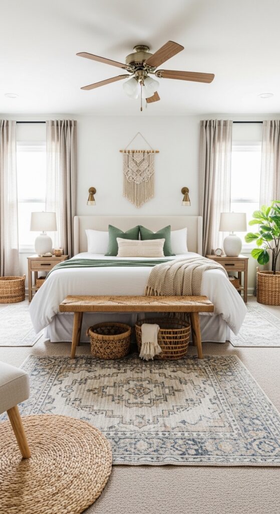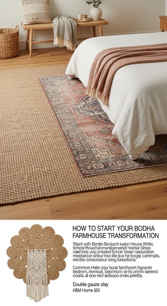 Why it works: Jute brings farmhouse earthiness, while a faded wool layer introduces boho pattern and softness underfoot. The stacked textures also help define the bed zone, which is especially useful in bedrooms with open floor space or minimal furniture.