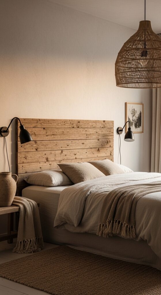 How to get it: Look for headboards in reclaimed pine, salvaged barn wood, or brushed acacia with visible knots. If you DIY, seal the wood in a matte water-based topcoat so the texture stays tactile without shedding dust onto your pillows.
