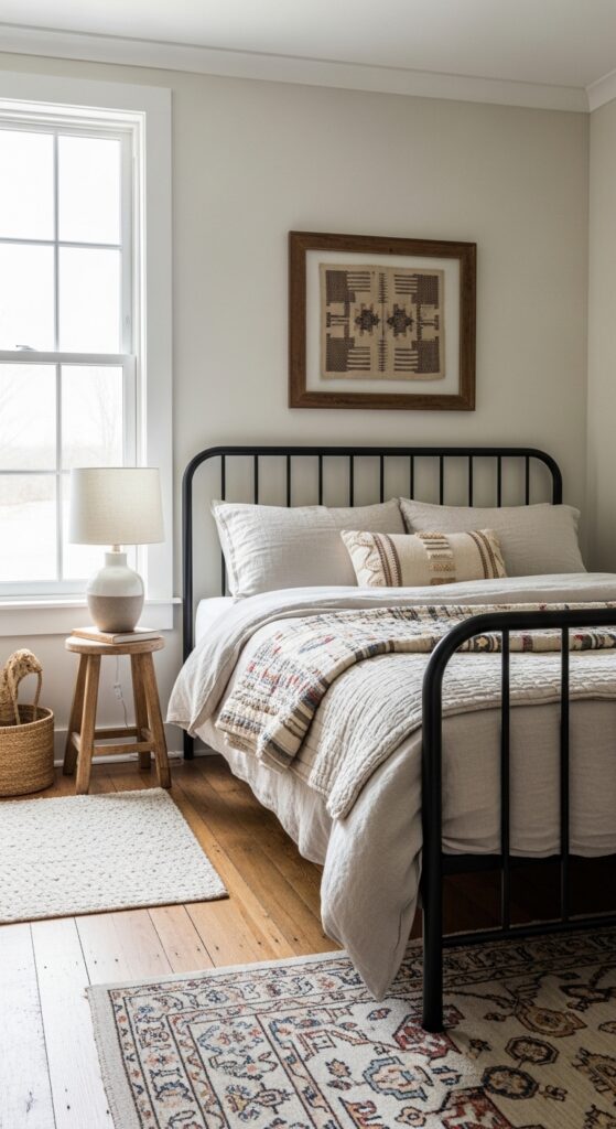 Why it works: A low bed frame helps the room breathe, which is useful in boho farmhouse bedrooms where texture layering can get visually dense. Thin iron lines or a simple spindle silhouette create contrast and definition without taking up too much visual mass.