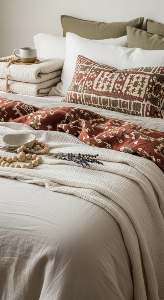 How to get it: Use one base duvet in flax or ivory, then add a crinkled cotton gauze blanket and a single block-print or mudcloth-style lumbar. Keep the pattern scale medium so it reads from across the room but doesn’t dominate the bed.