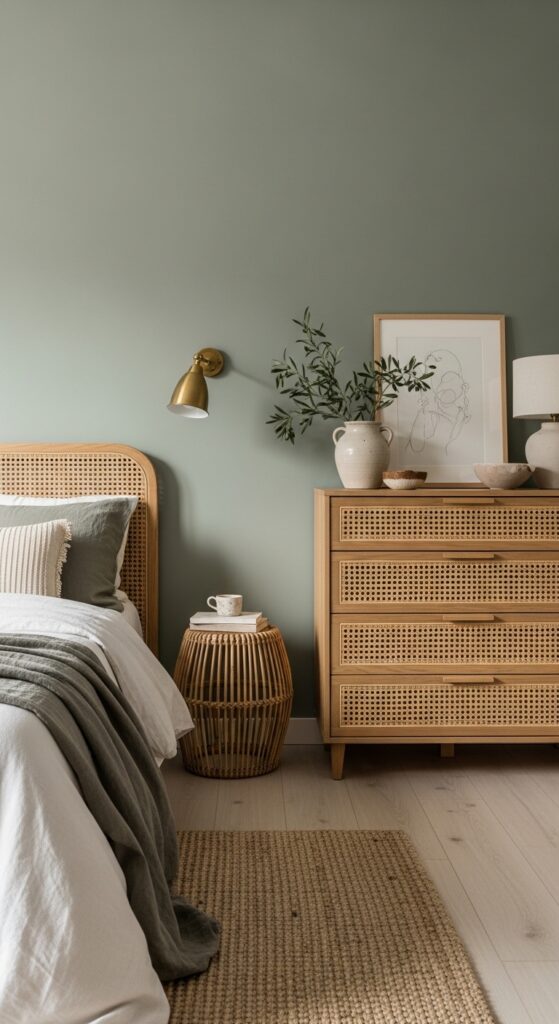 Why it works: Sage has enough pigment to shape the room but stays soft enough for sleep. Paired with oat and warm wood, it creates tonal contrast rather than sharp contrast, which is what gives boho farmhouse bedrooms their calm, collected depth.
