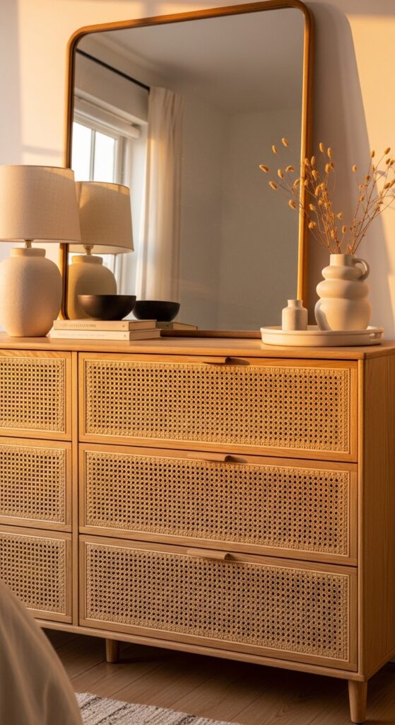 How to get it: Use a cane-front dresser or retrofit flat drawer fronts with cane webbing and half-round trim. Keep the frame in a pale oak, light walnut, or whitewashed finish so the weave remains the star.