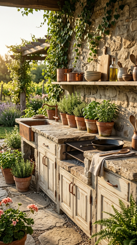 Picture rough-hewn stone countertops kissed by afternoon sunlight, surrounded by weathered wood cabinetry and trailing herbs in terracotta pots — a backyard kitchen that feels ancient and alive.