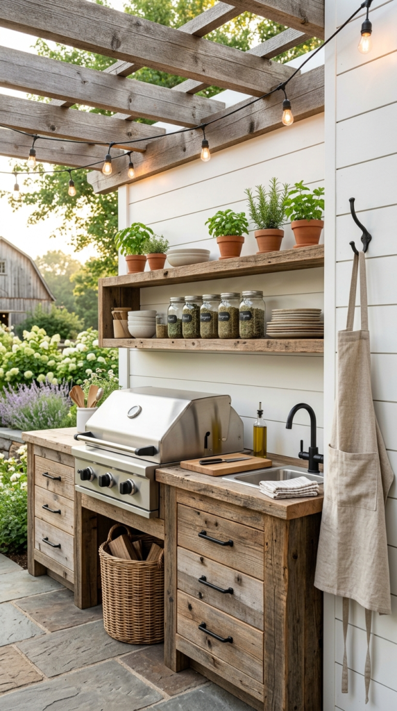 Styling Tips: Mount open wooden shelves against the shiplap wall for displaying vintage mason jars, lanterns, and potted herbs. Use black iron hardware to anchor the farmhouse look. This setup works beautifully for suburban backyards where you want the kitchen to feel like a true outdoor room. Pair with a neutral linen apron hung casually on a hook for that authentic farmhouse charm.