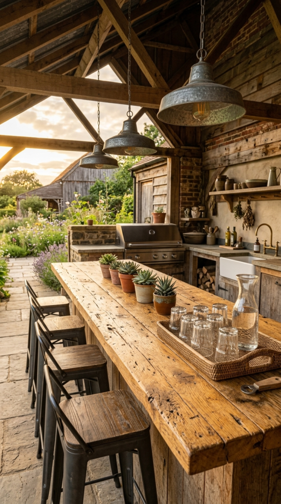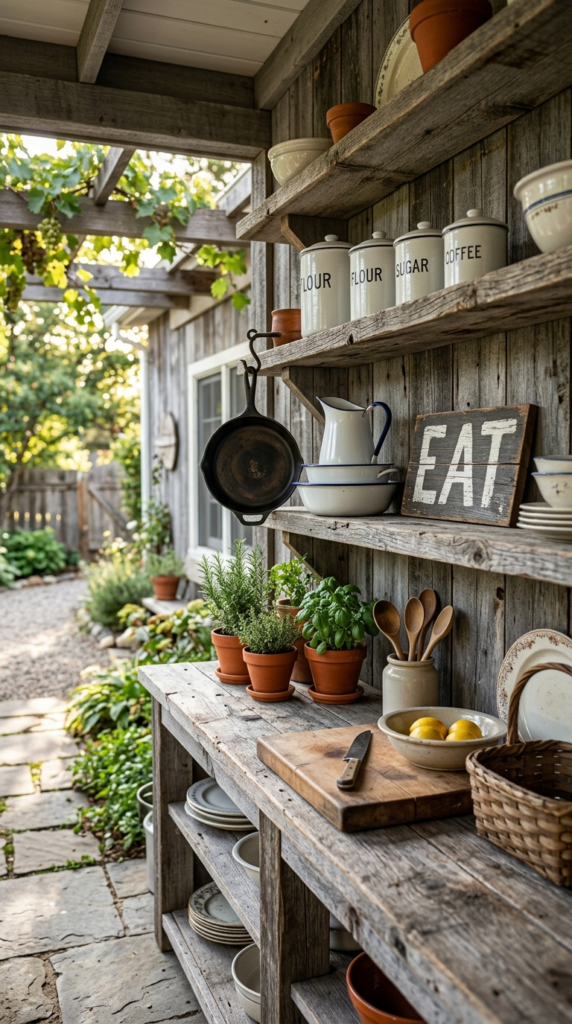 Open shelving made from authentic barn wood turns your outdoor kitchen into a curated display of farmhouse treasures — equal parts functional and absolutely stunning.
