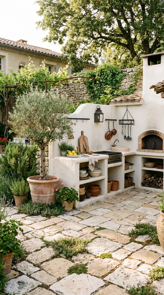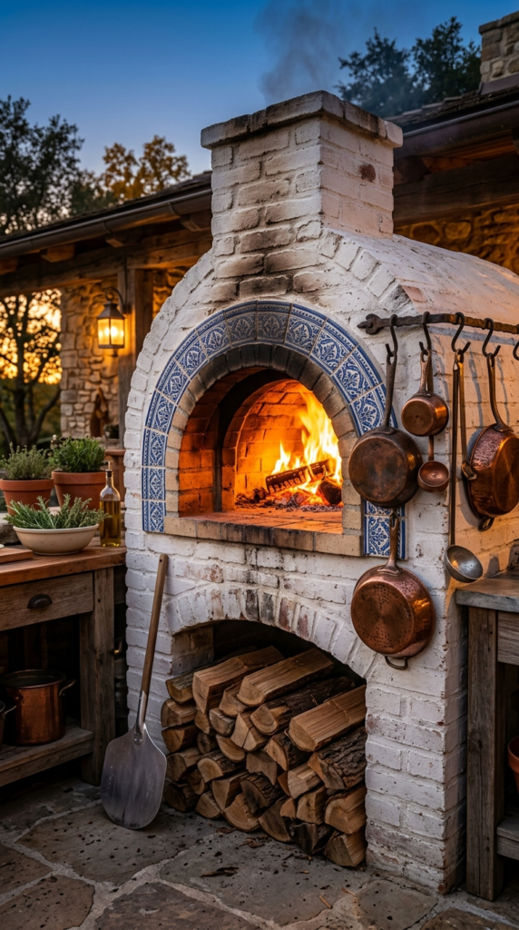 Styling Tips: Surround the base of the pizza oven with stacked firewood for both practicality and visual texture. Add a hand-painted tile mosaic on the oven arch for a touch of artisan character. Hang copper pots and a pizza paddle nearby on wrought iron hooks. This is a dream setup for families who love weekend pizza nights under the stars.