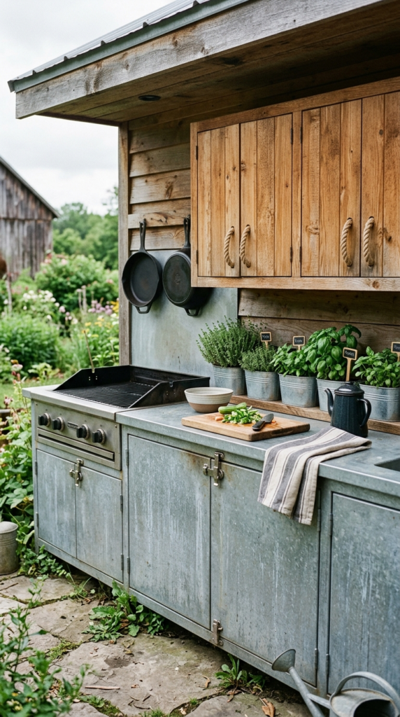 The marriage of galvanized steel and warm cedar wood creates a farmhouse outdoor kitchen that feels rugged, handsome, and effortlessly cool.