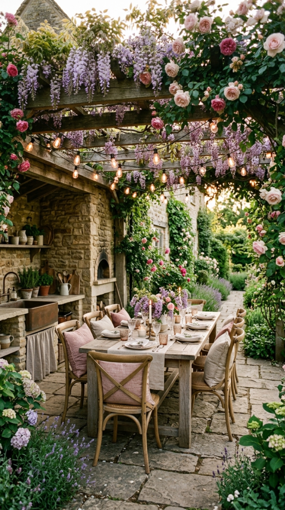 Styling Tips: Plant wisteria or climbing roses around the pergola posts and allow them to grow freely over the lattice for a romantic look. Add Edison bulb string lights woven through the vines for evening ambiance. Use natural linen seat cushions and a weathered farmhouse dining table underneath. This is the ultimate setup for romantic dinner parties and summer celebrations.