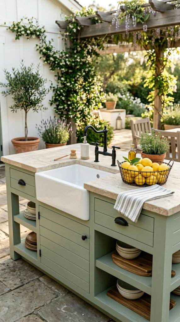 Styling Tips: Choose a white porcelain farmhouse sink with a brushed nickel or matte black bridge faucet. Frame the island in shiplap or tongue-and-groove wood painted in a soft gray or sage green. Fill a nearby wire basket with lemons for a pop of sunny color. This is a practical dream for those who cook seriously outdoors and want their outdoor kitchen to mirror the beauty of their indoor one.