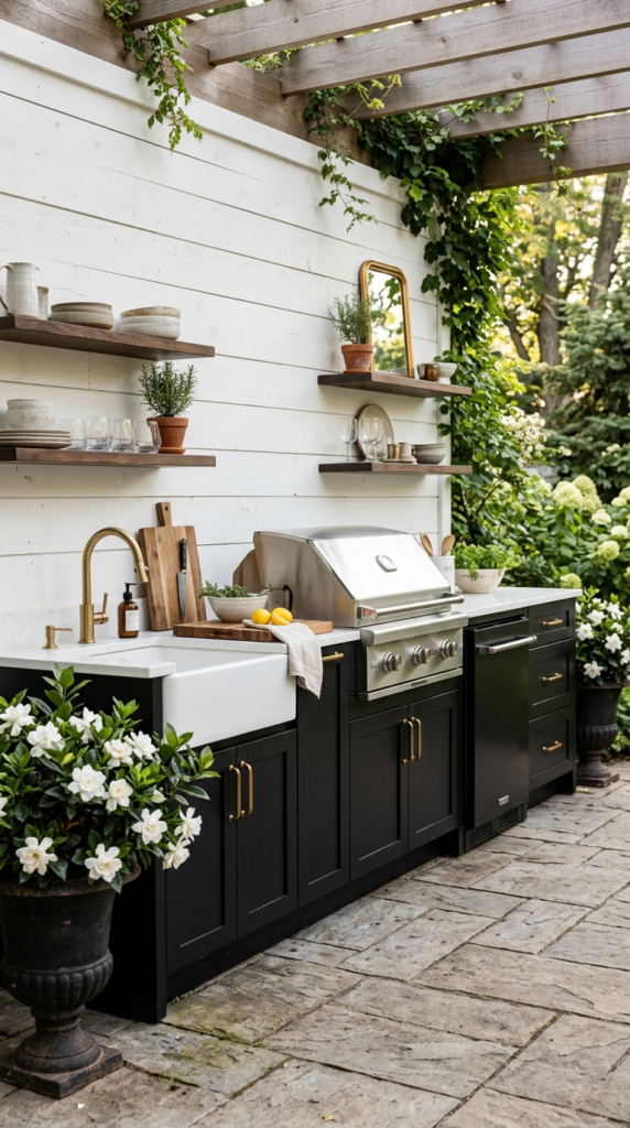 Styling Tips: Balance the drama of black cabinets with white quartz or marble-look countertops. Add white shiplap on the back wall and gold or brass fixtures to warm the contrast. Use black iron planters with white flowers like gardenias or ranunculus for continuity. This is a showstopper design for those who want their outdoor kitchen to make a statement.