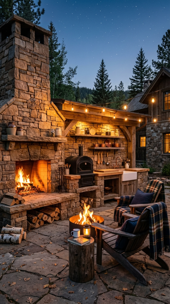 Styling Tips: Choose a warm-toned fieldstone or river rock for the stacked stone finish. Build in a fireplace or firepit directly adjacent to the kitchen counter for seamless flow. Layer in cozy textures with plaid wool blankets draped over nearby Adirondack chairs. This is a year-round outdoor living dream for families who entertain in every season.
