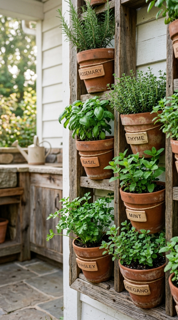 Styling Tips: Use a pallet-style wood frame with individual metal buckets or terracotta pots mounted for each herb. Label each pot with hand-stamped clay tags or chalkboard stakes. Keep the rest of the kitchen neutral — white, gray, or natural wood — so the greenery wall becomes the star. This is a must-have for the cook who insists on fresh herbs and believes the garden belongs in the kitchen.