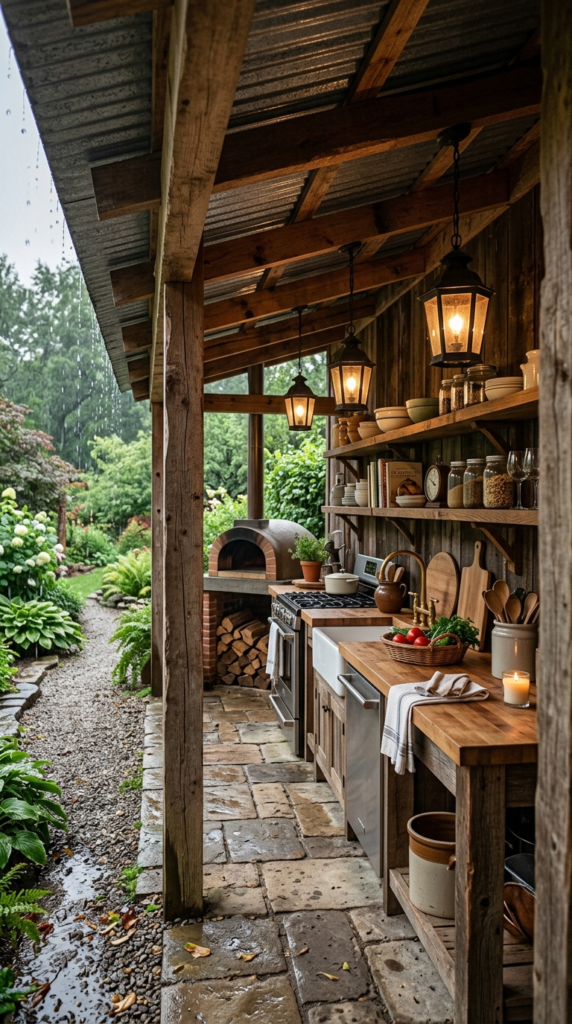 The gentle patter of rain on a tin roof overhead transforms your outdoor kitchen into a nostalgic, perfectly sheltered farmhouse cooking nook that feels like pure childhood magic.