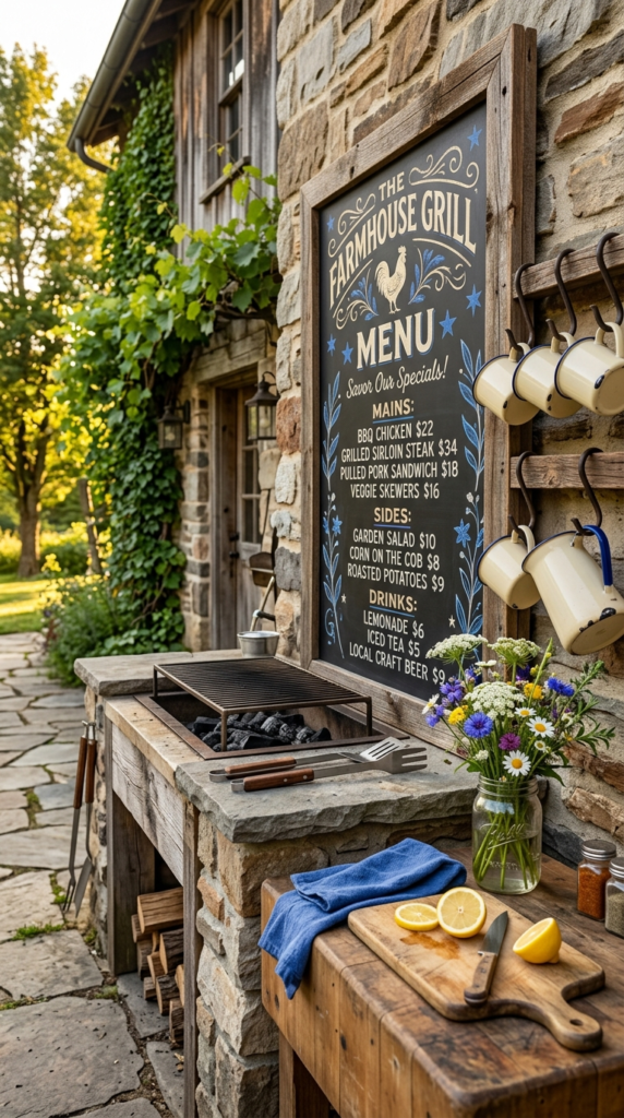 A grill station dressed up with vintage enamelware accents, hanging cast iron, and a hand-lettered menu chalkboard is the most charming backyard setup you’ve ever seen.