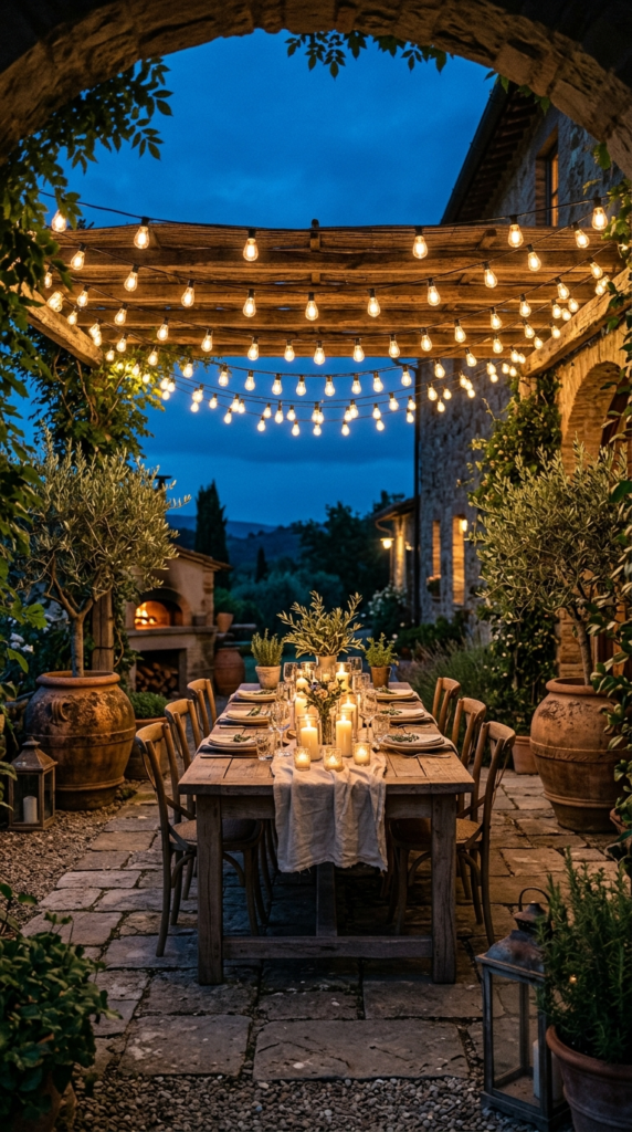Styling Tips: Layer Edison bulb string lights in multiple rows across the overhead frame for a dense, magical canopy effect. Combine with potted topiaries or olive trees in large terracotta pots at the kitchen corners. Use a long farmhouse table below with linen runners and pillar candles for a complete tablescape. This setup is pure magic for evening summer parties and is endlessly photogenic.