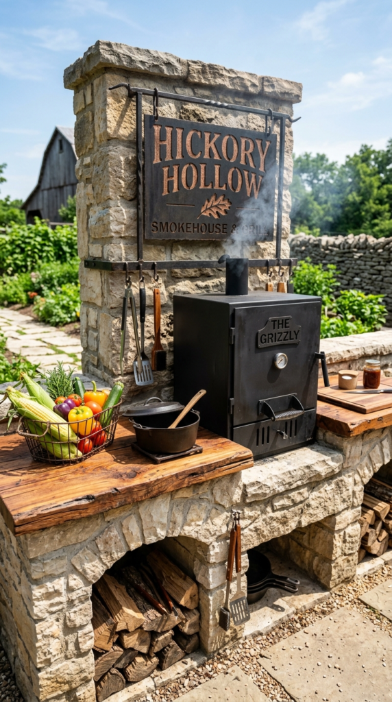 Styling Tips: Choose a natural limestone or fieldstone cladding for the built-in smoker structure. Add a wide cedar countertop on either side for prep and plating space. Hang a custom-branded cutting board or cattle brand-style iron sign above the station. Pair with an industrial metal stool and a wire basket of fresh corn or vegetables for a farm-to-table feel.