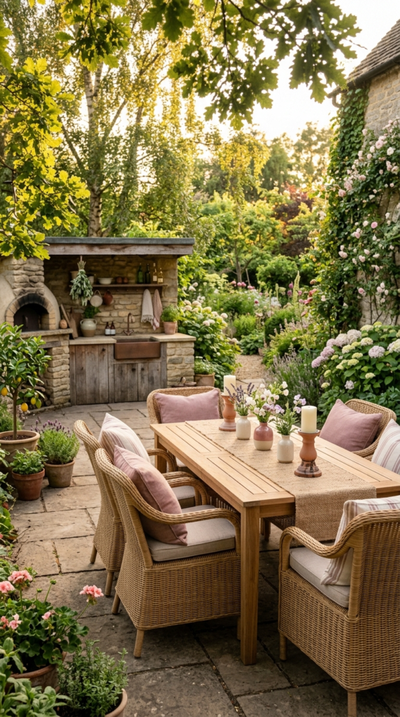 Pairing a functional farmhouse outdoor kitchen with a natural wicker and rattan dining set creates a layered, tropical-meets-rustic backyard that’s relaxed, beautiful, and endlessly inviting.