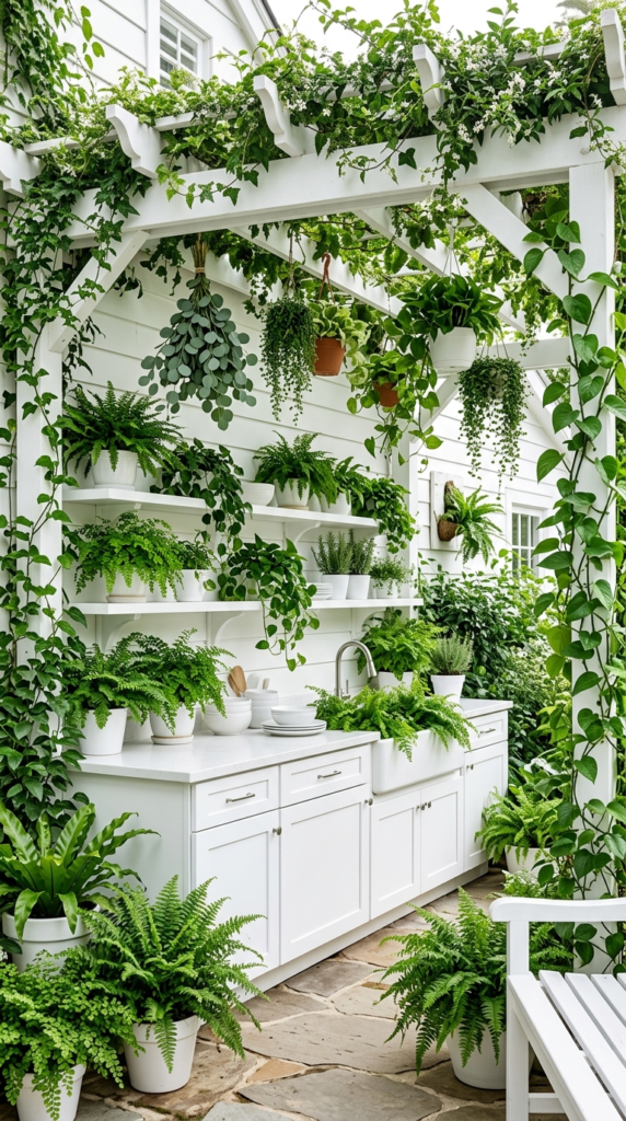 Styling Tips: Paint everything — cabinets, counters, walls — in a crisp warm white. Then counterbalance with maximal greenery: overflowing potted ferns, climbing pothos, hanging eucalyptus bundles, and vine-wrapped posts. Use only green and white in the space for a graphic, high-impact look that photographs extraordinarily well. This is the ultimate choice for those who want their outdoor kitchen to go completely viral on Pinterest.