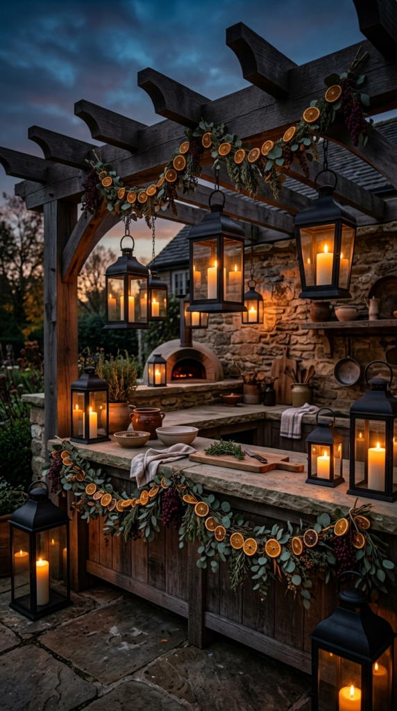 Styling Tips: Use a mix of floor-standing and hanging iron lanterns in varying heights to create a layered lighting landscape. Fill them with pillar candles or LED candle inserts for a wind-safe glow. Place lanterns on the countertops, along pathways, and hung from pergola beams. Combine with garland made from dried oranges, cinnamon sticks, and eucalyptus for seasonal fragrance and beauty. This is the ultimate setup for fall and holiday outdoor entertaining.