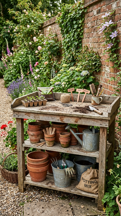 Vibe sentence: A well-used potting bench doesn’t just hold your tools — it becomes the rustic heart of the entire garden, rich with the evidence of every season worked.