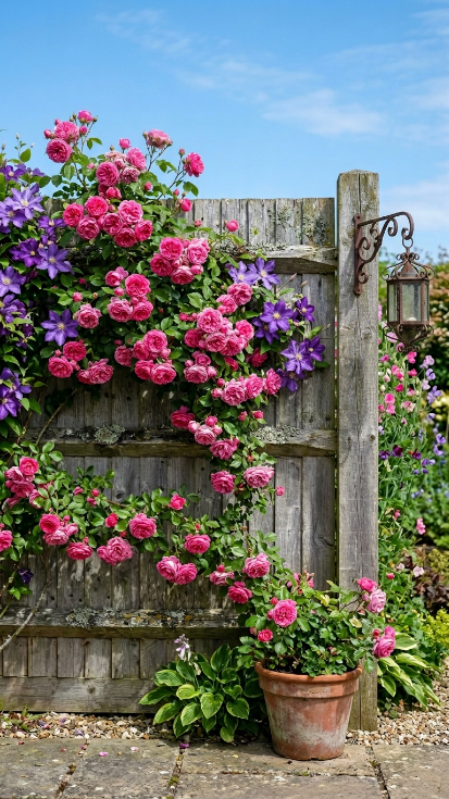 What makes it work: The contrast between the cool, neutral tone of weathered grey timber and the intense warmth of deep rose pink is a classic combination that never fails. Mixing two climbing plants of different textures — the full, layered blooms of roses against the open, star-shaped clematis flowers — creates visual complexity that a single plant species cannot achieve alone.