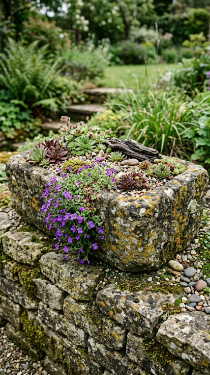 Vibe sentence: A lichen-crusted stone trough planted with alpines sits in a garden like a piece of geological time — ancient, self-possessed, and quietly extraordinary.