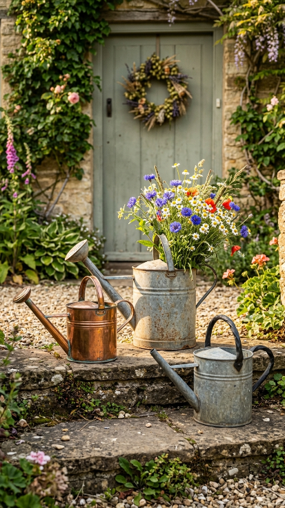 Vibe sentence: A grouping of vintage watering cans at a cottage door or garden entrance is one of the most universally charming rustic decor moments — equal parts welcome and whimsy.