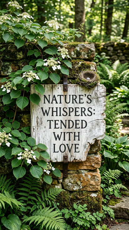 Vibe sentence: A hand-lettered sign on a piece of driftwood or reclaimed timber gives a garden a voice — quiet, personal, and unmistakably human.